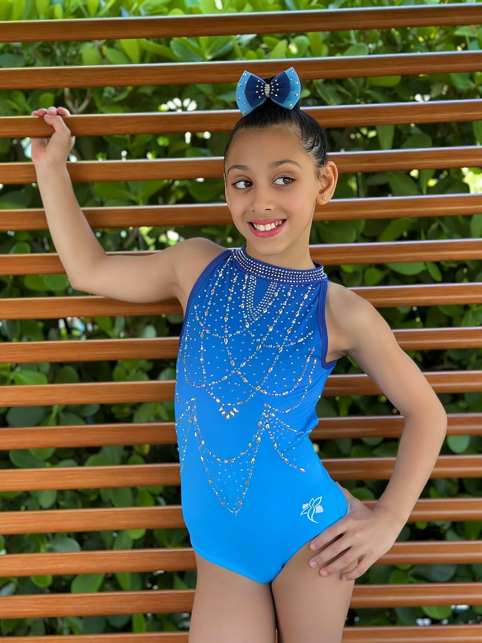 Radiate elegance in this dazzling blue leotard, designed with cascading rhinestone patterns that shimmer like jewels under the light. The high neckline is accented with a sparkling rhinestone collar for a regal touch, while the open crisscross back provides both style and breathability. With its sleek fit and glamorous design, this leotard is perfect for athletes who want to stand out with confidence and grace in training or on the competition floor.