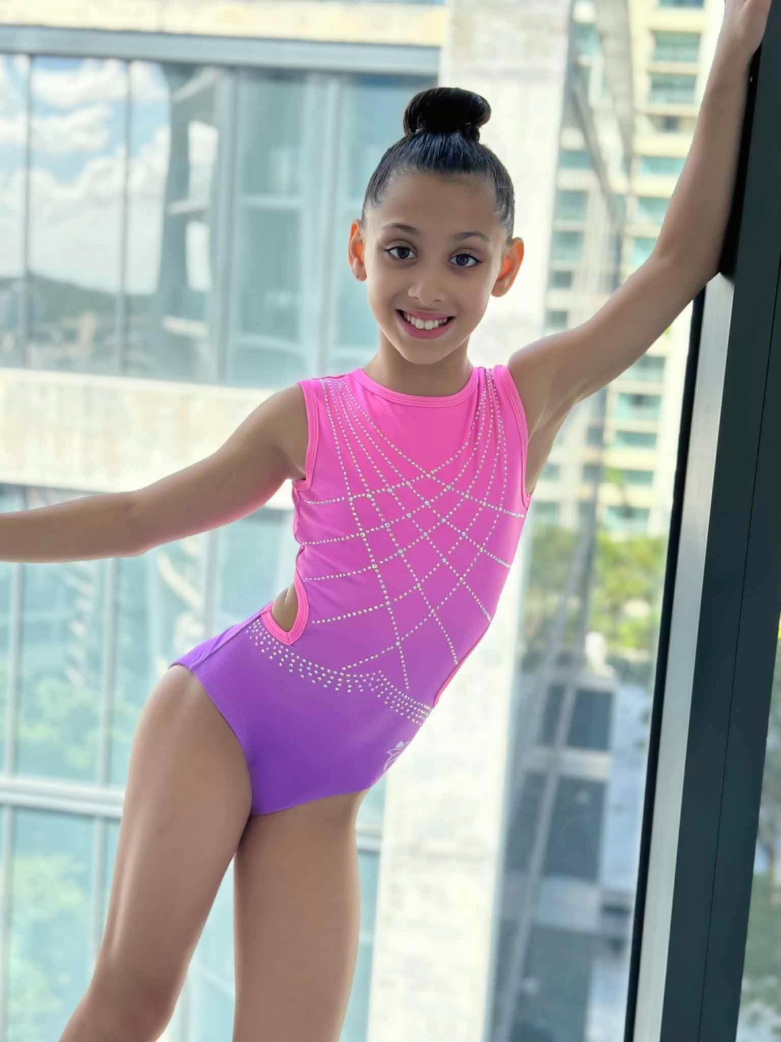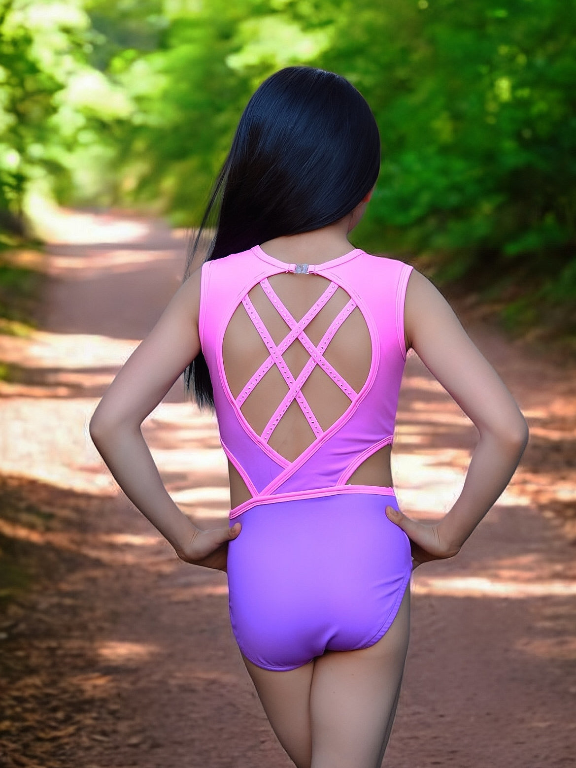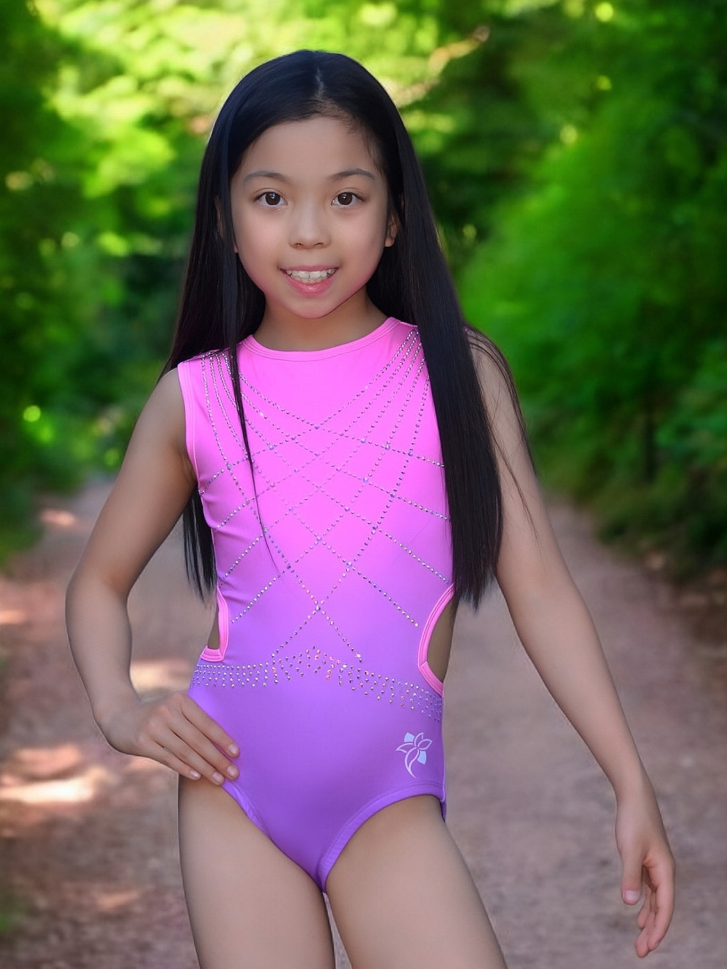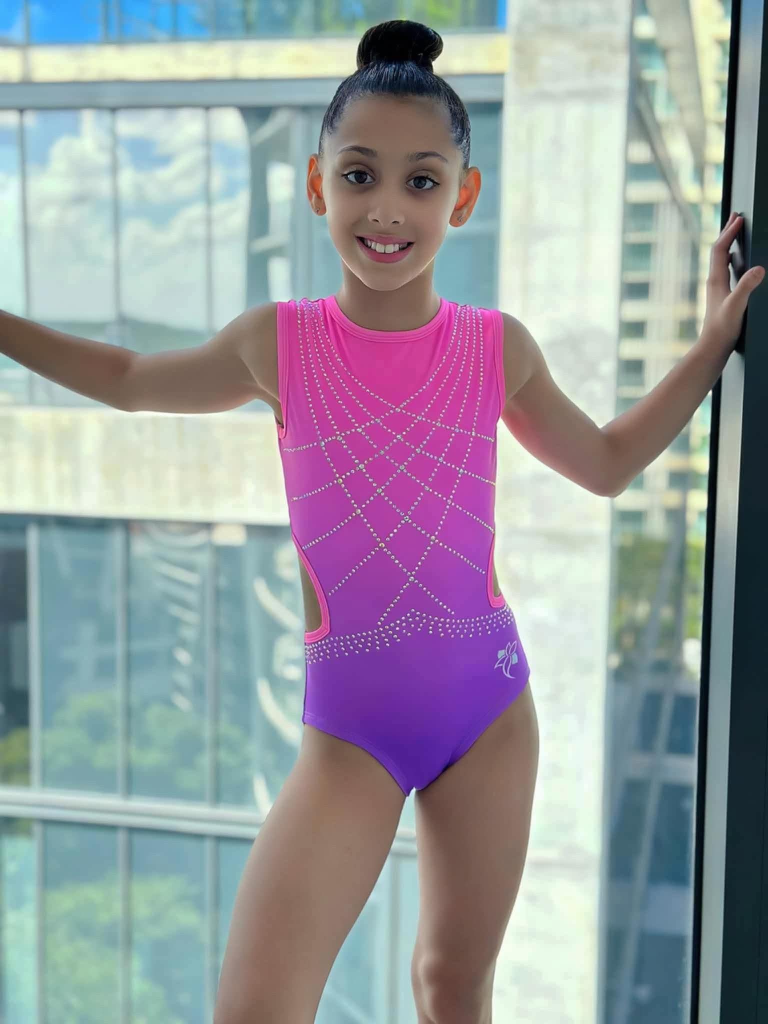 This stunning leotard features a vibrant pink-to-purple ombré design accented with sparkling rhinestone patterns across the front for maximum shine. The eye-catching open back showcases an intricate crisscross strap design with rhinestone detailing, offering both elegance and support. Side cutouts add a modern touch while ensuring comfort and flexibility. Perfect for training or the competition floor, this leotard blends bold style with performance-ready comfort.